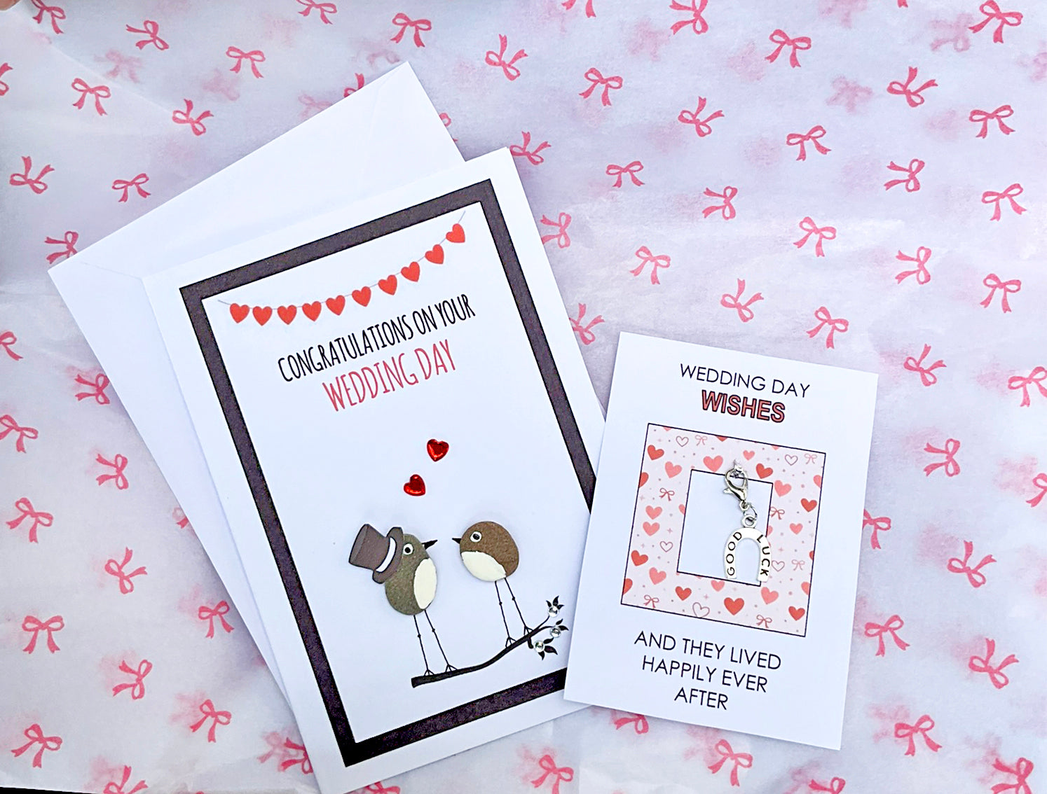 Free second class shipping included on all my products ! A beautiful handmade “pebble art” Wedding Card for that special occasion. Blank inside for your own personal message, complete with envelope . A keepsake clip-on charm is also included in the box, ideal to pop inside the card as a little reminder of their special day .